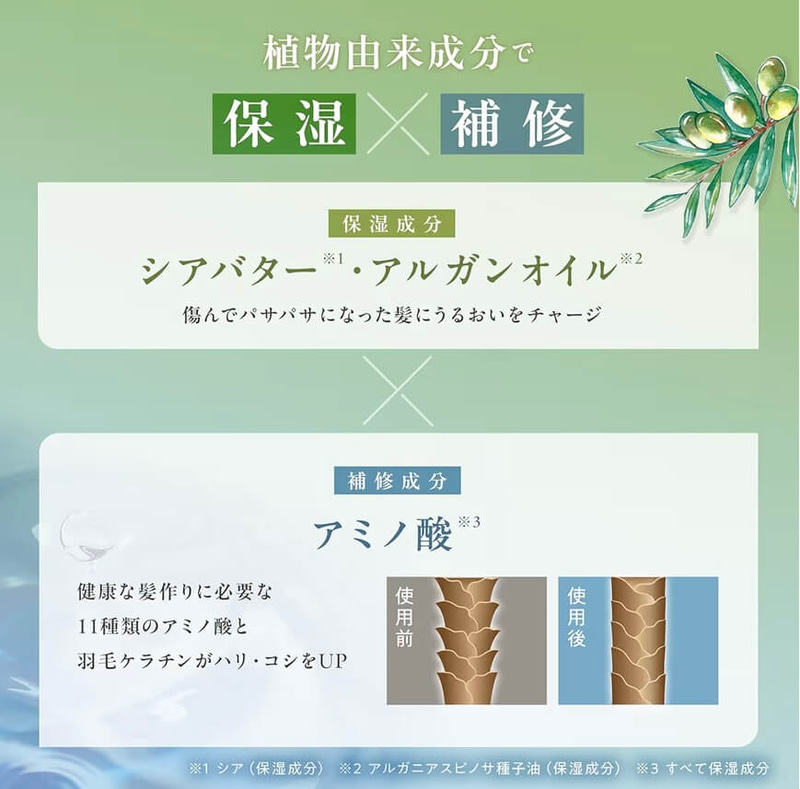 髪のパサつきやうねりを整えるサポートをしながら、しっとり感と軽やかさを両立しやすい処方が特徴です。ダメージが気になる方にとって、補修と保湿の両方を意識できるのは心強いポイントです。