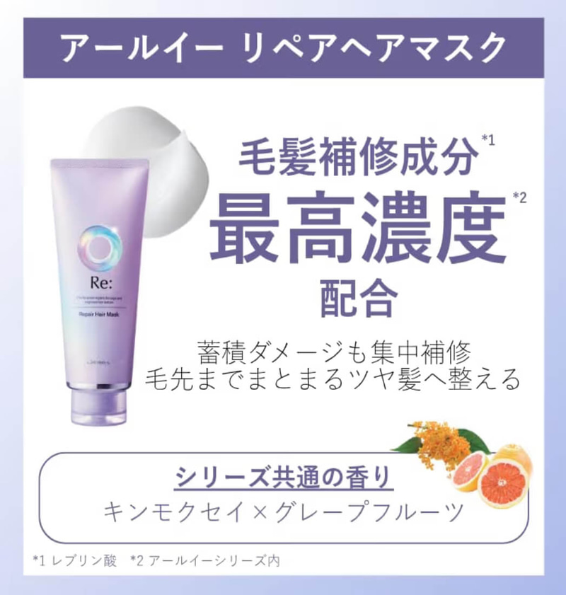 | ルシードエル アールイー リペアマスク | 金木犀とグレープフルーツの華やかさ | なめらかでしっとりした手触り | うねりが抑えやすくまとまりやすい | 濃厚なマスクタイプで泡立ちは不要 | レブリン酸やケラチンアミノ酸配合 | 市販品で購入しやすい価格帯 |