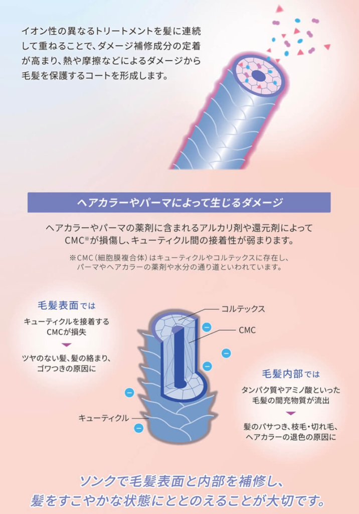 ブランド「ソンク」の“スマートトリートメント”ラインとして展開され、活性ケラチンやトステア®などの毛髪補修成分を配合。さらにアニオンベースコートやエルカラクトンなどのコーティング成分を採用しており、補修・補強・コーティングの3方向からケアをサポートします。