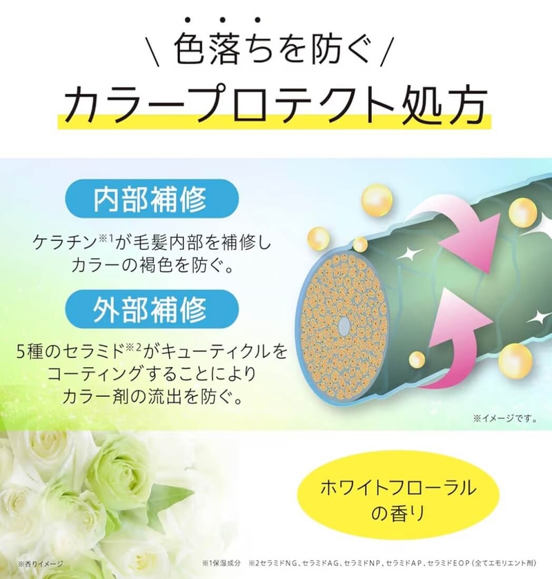 うるおいを保持しやすい加水分解コラーゲンと、カラーをキープしやすいセラミド群が組み込まれています。乾燥や褪色を抑えるサポートに役立ちます。
