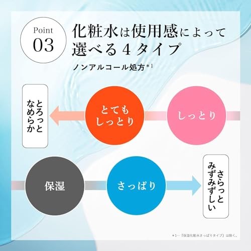 乾燥肌にはとろみタイプ、混合肌にはさっぱりタイプを選びましょう。使用感が大きく変わります。
