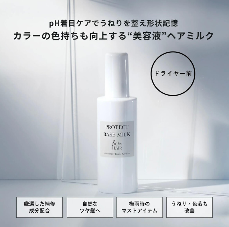 アンドビー プロテクトベースミルクは補修・保湿成分を複合的に配合し、髪のうねりやパサつきをサポートします。