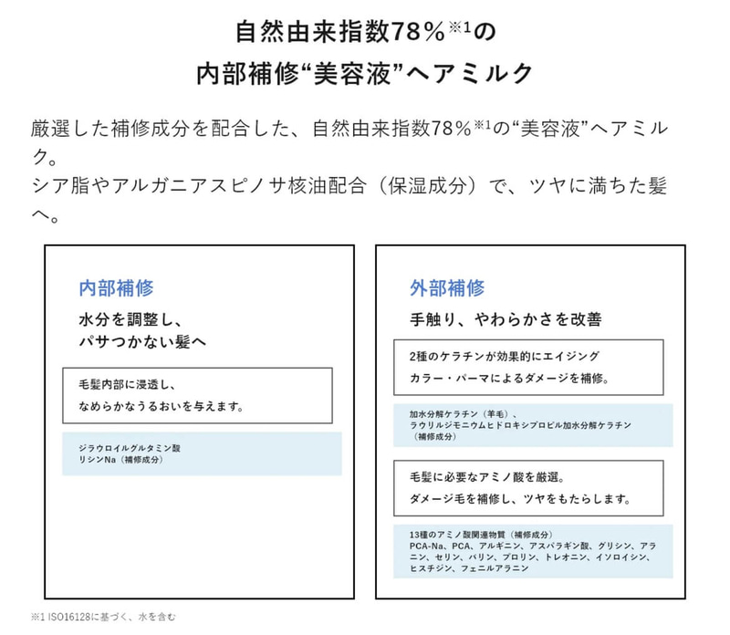 水,ジメチコン,セタノール,トリ(カプリル酸/カプリン酸)グリセリル,水添ファルネセン,加水分解水添デンプン,ペンチレングリコール,ベタイン,リンゴ酸ジイソステアリル,ベヘントリモニウムクロリド,ステアラミドプロピルジメチルアミン,エタノール,ステアリン酸グリセリル,イソステアリン酸水添ヒマシ油,レブリン酸,ヒドロキシエチルセルロース,エチルヘキシルグリセリン,カプリル酸グリセリル,ラウリルジモニウムヒドロキシプロピル加水分解ケラチン,ジラウロイルグルタミン酸リシンNa,γ-ドコサラクトン,ラウリン酸ポリグリセリル-10,シア脂,アルガニアスピノサ核油,ヒマワリ種子油,ホホバ種子油,BG,PCA-Na,乳酸Na,加水分解ケラチン,アルギニン,アスパラギン酸,PCA,グリシン,アラニン,ヘマチン,加水分解シルク,セリン,バリン,プロリン,トレオニン,イソロイシン,ヒスチジン,フェニルアラニン,クエン酸Na,トコフェロール,香料