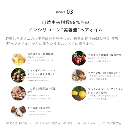 自然由来指数98%でノンシリコーン処方。コメヌカ油やマカデミア種子油などの植物オイルを中心に配合し、軽やかな質感とツヤを両立しやすい処方が特徴です。