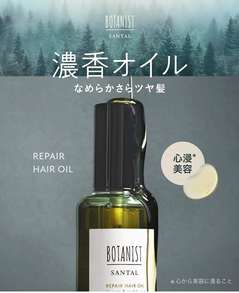 | ボタニスト サンタル ヘアオイル | ウッディ系の濃厚な香り(パロサント・サンダルウッド) | オイル補修でなめらかに整う | 毛先までまとまりやすい仕上がり | オイルタイプなので泡立ちは対象外 | アミノエチルチオコハク酸ジアンモニウム・γ-ドコサラクトン配合 | 90mLで中価格帯、デパコスより継続しやすい | |