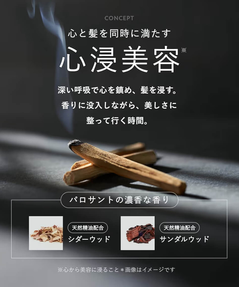 パロサントやサンダルウッドのウッディな香りが一気に広がり、リッチな印象を与えます。塗布直後は重さよりもしっとり感が先に感じられます。