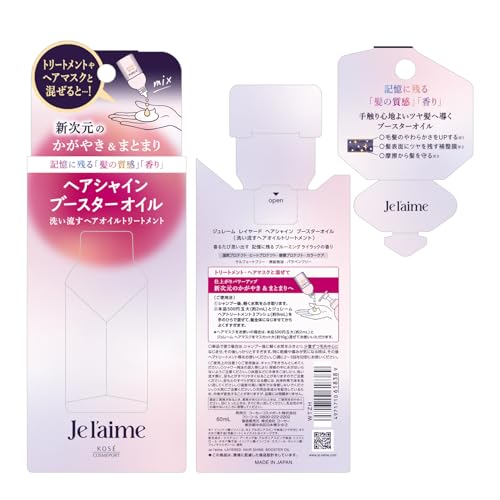 | ジュレーム レイヤード ヘアシャイン ブースターオイル | 金木犀を基調にしたフローラルが長く香る | なめらかで指通りが軽やか | 髪がまとまり扱いやすい | オイルのため泡立ちはなし | イソノナン酸イソノニル・植物オイル・トコフェロール配合 | 市販価格で手に取りやすい |