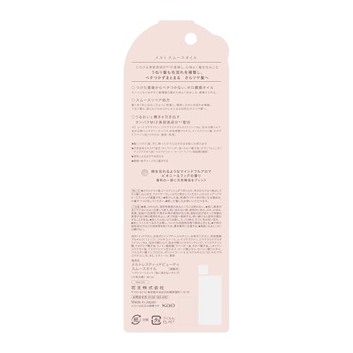 | メルト スムースオイル | ピオニー&フィグの香りは華やかで好印象、やや持続感は控えめ | ゼロ膜感触で指通りが軽やかにサポート | 湿気による広がりを抑え、まとまりやすさを実感 | 補修系成分と植物オイルをバランスよく配合 | 軽やかな仕上がりを求める方には価格相応、リピートも検討しやすい |