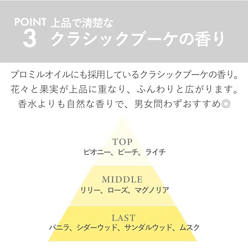 プロミルオイルクラシックブーケで華やかツヤと滑らかさを感じやすいやや重さが出る場合ありオイルのため泡立ちなし16種天然オイルの多用途設計大容量でコスパ良好