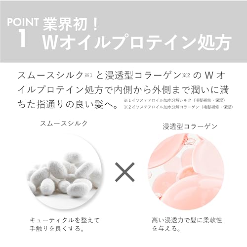 このオイルはイソステアロイル加水分解シルクやイソステアロイル加水分解コラーゲンを含み、補修と保湿をサポートする処方です。加えて14種類の植物オイルが配合され、まとまりやツヤ感を与えやすい特徴があります。