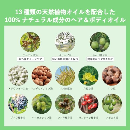 セサミンオイルをベースに、ホホバ種子油やシア脂油など多様なオイルを組み合わせており、髪にツヤ感とうるおいをサポートします。