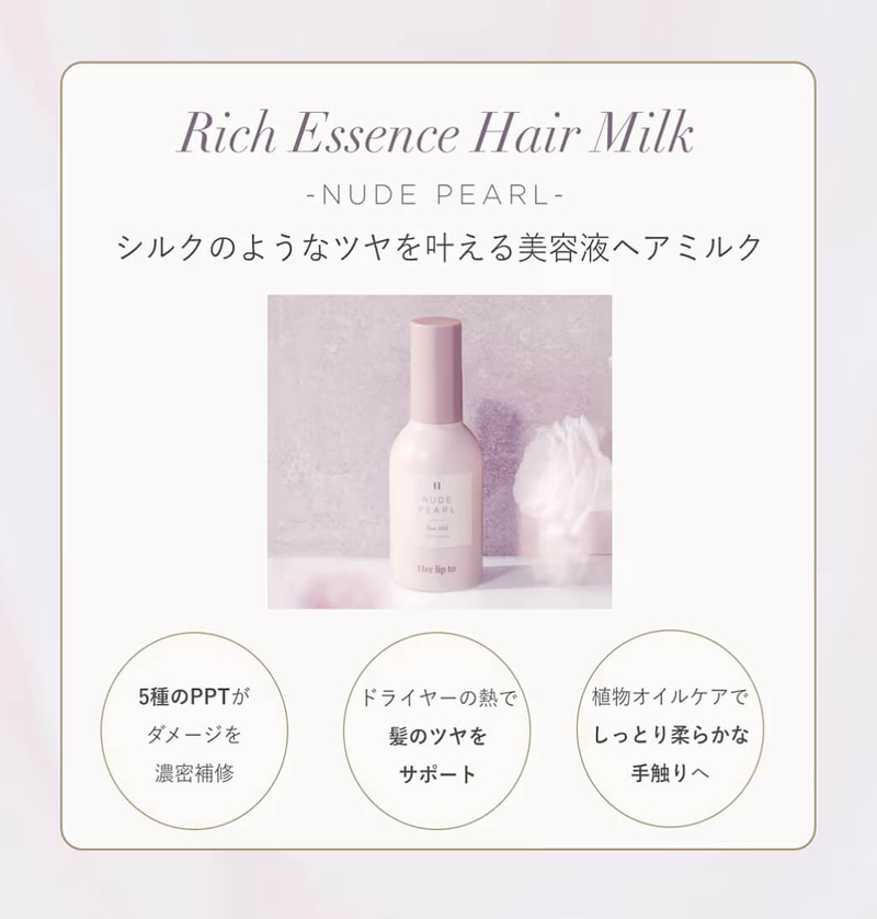 無理のない範囲で、普段の美容習慣にできることから試していきましょう。RICH ESSENCE HAIR MILK – NUDE PEARL -は、ヘアケアや保湿ケアを整えたい方に日常的に取り入れやすいアイテムです。