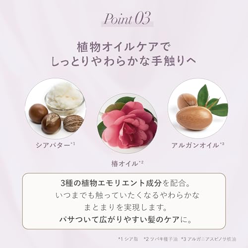 椿油やアルガンオイル、シアバターなどの植物由来成分が髪に柔らかさとうるおいを与え、まとまりを整えやすくします。