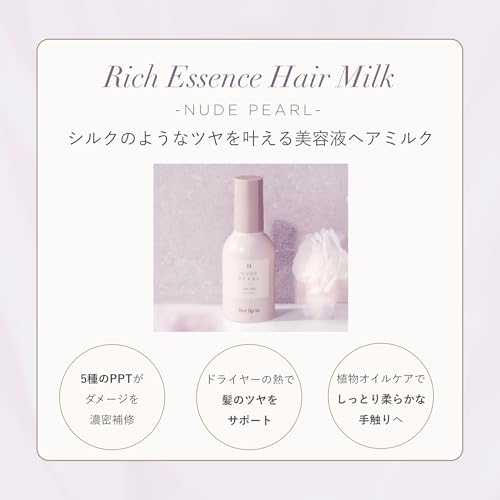 RICH ESSENCE HAIR MILK – NUDE PEARL -には加水分解シルクや加水分解ケラチンなどの補修成分が含まれ、ダメージを受けやすい髪を整えるサポートをします。ただし仕上がりの実感には個人差があります。