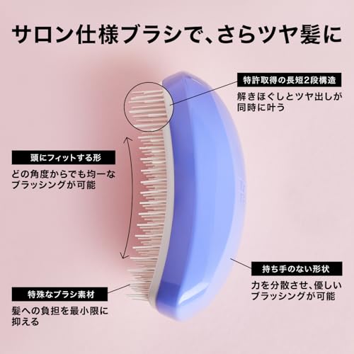 このブラシはとても軽くて、毎日のブラッシングに使いやすいタングルティーザーのスタンダードタイプです。特別な素材で作られたブラシの毛が、長いものと短いものの二段構造になっていて、絡まった髪を根元から優しく解きほぐします。そして、同時に髪の表面を覆っているキューティクルをきれいに整えてくれます。